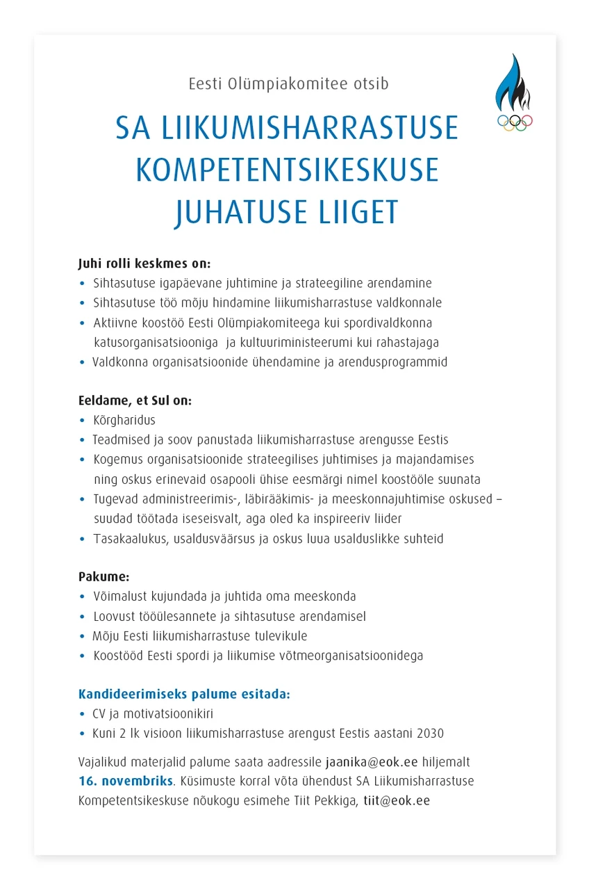 SA Liikumisharrastuse Kompetentsikeskus on tänaseks tegutsenud juba 3 aastat. Otsime juhatuse liiget, kes võtaks sihtasutuse juhtimise enda kanda, hindaks seni tehtu mõju liikumisele ning suunaks sihtasutuse fookuse konkreetsetele tegevustele elukaareülese liikumise arendamisel.